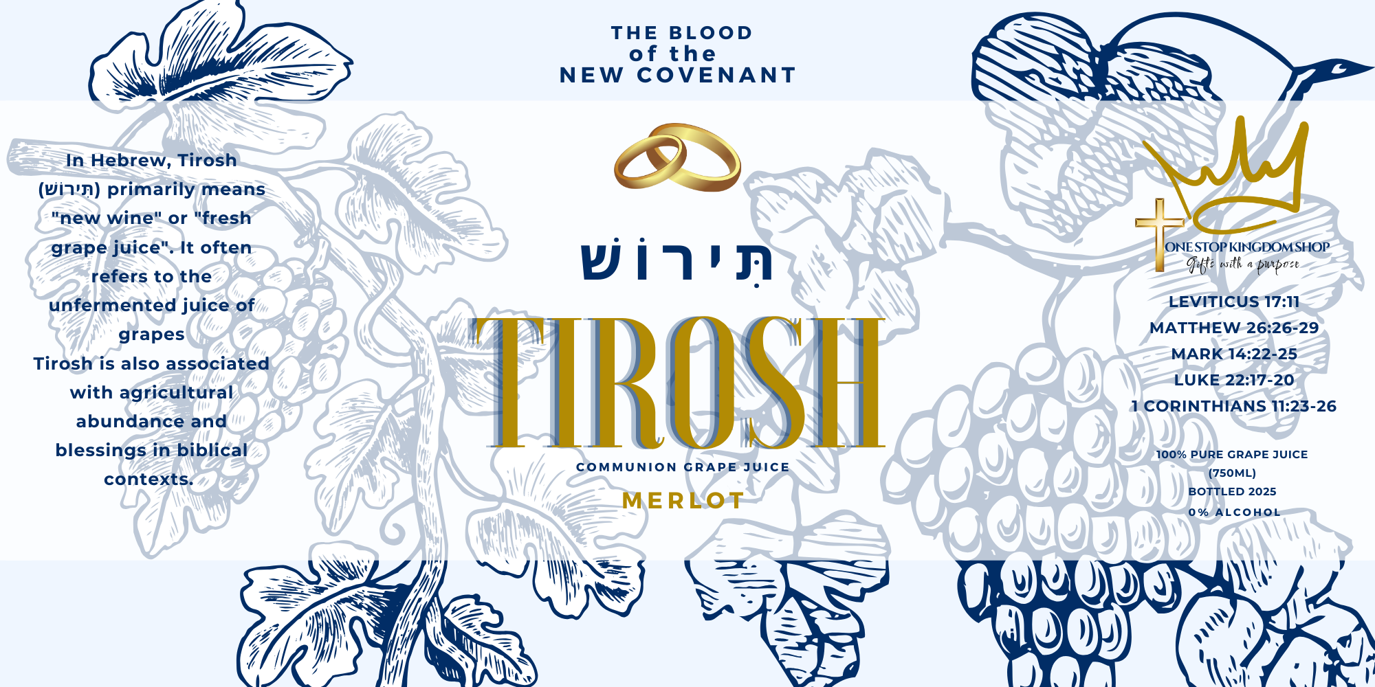 Tirosh is the biblical word often translated as “new wine” or “fresh grape juice.” In Scripture, tirosh represents purity, blessing, and the untouched goodness of the vine — something set apart and undefiled.